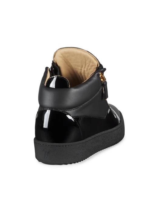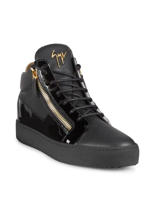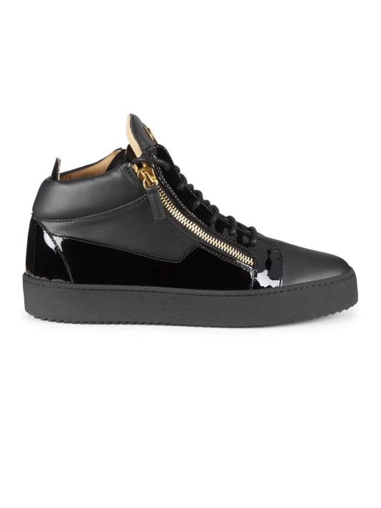 These sneakers feature panels of patent and matte leather, finished with goldtone zippers and a logo plaque at the tongue.