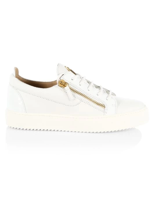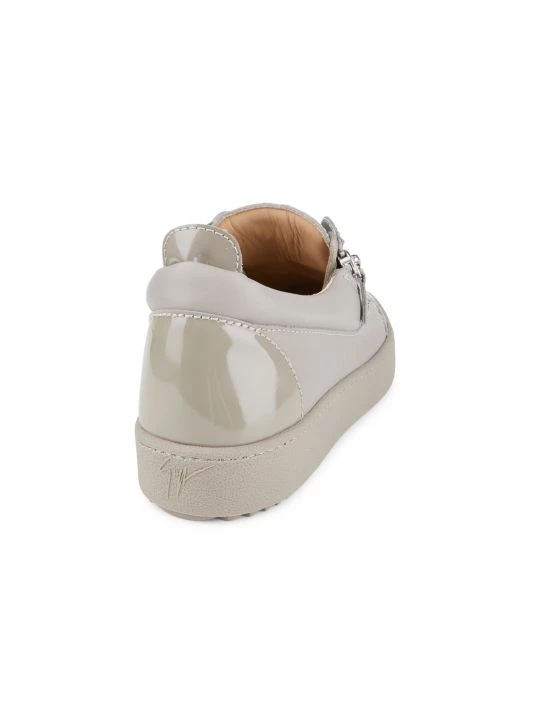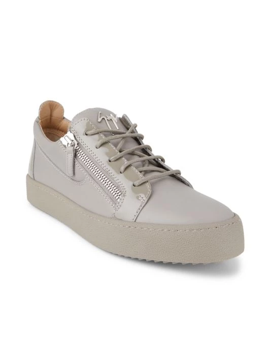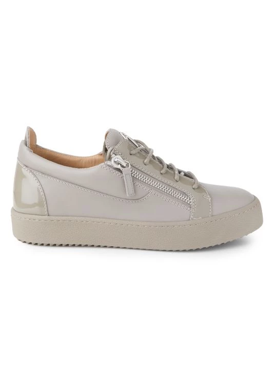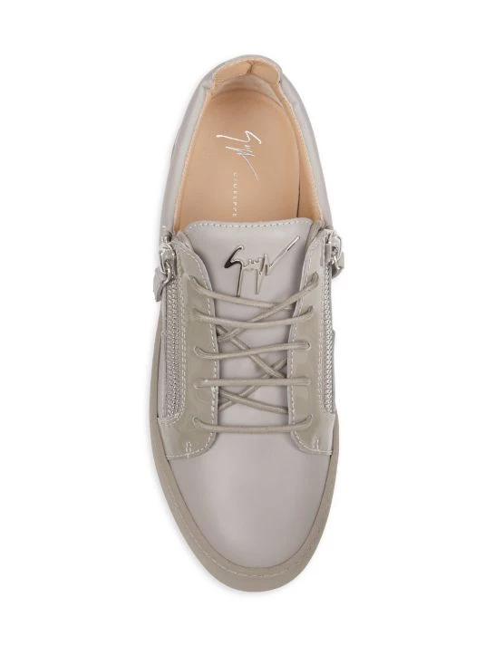Silvertone logo adorns leather sneakers with side zips and glossy back heel.