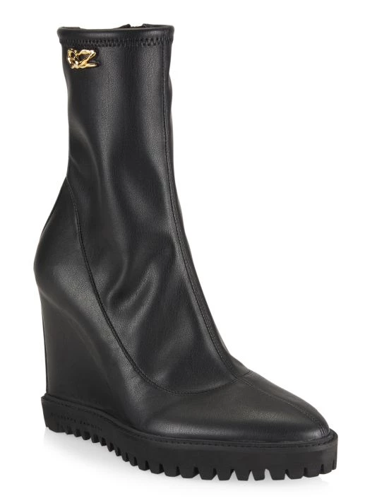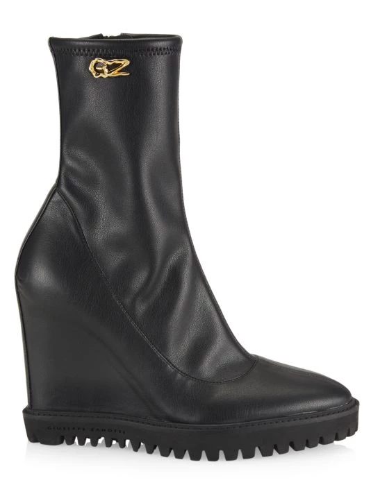Anchored by a lugged wedge heel, the Candis boots by Giuseppe Zanotti are made in Italy of calf leather punctuated with hammered logo hardware.