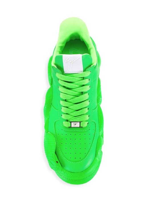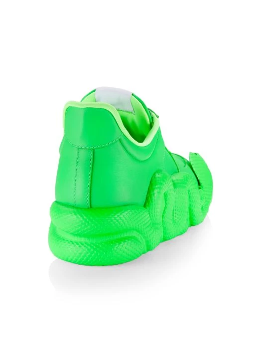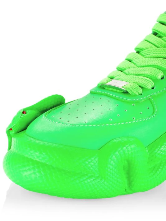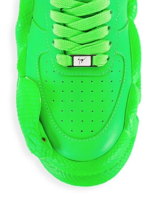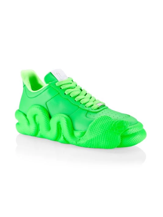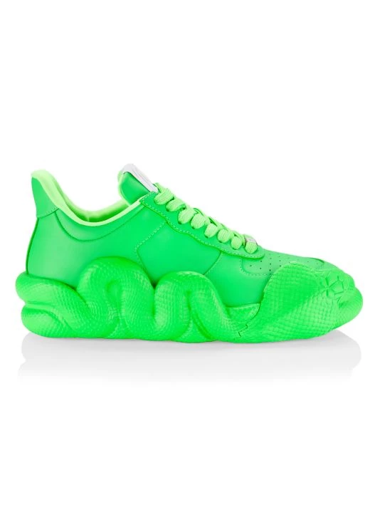 An artistic pair of low-top sneakers featuring a snake motif along the base.