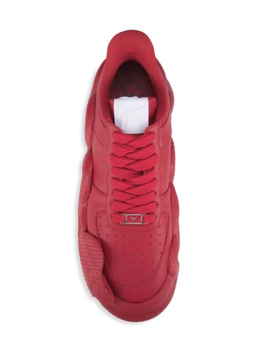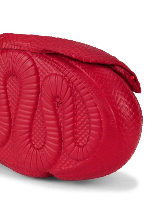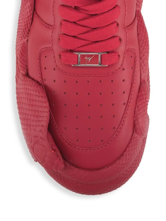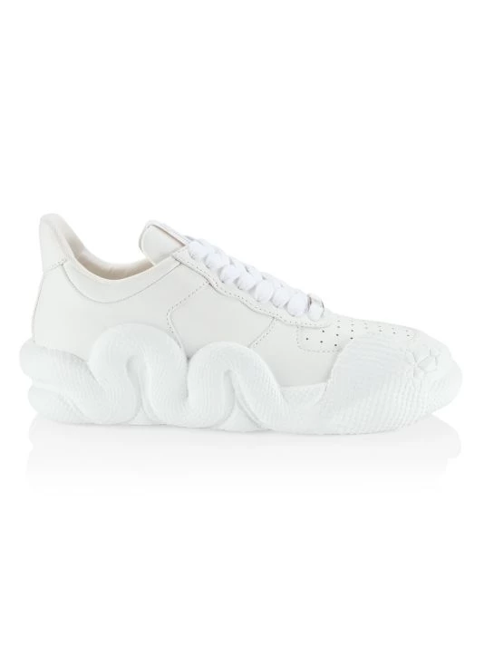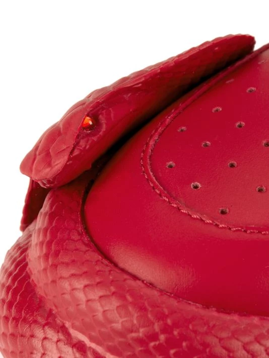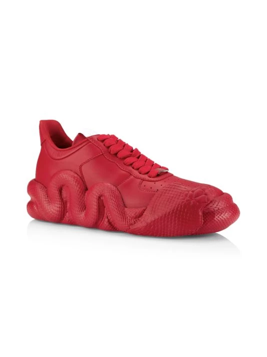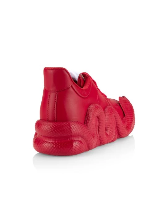 An artistic pair of low-top sneakers featuring a snake motif along the base.