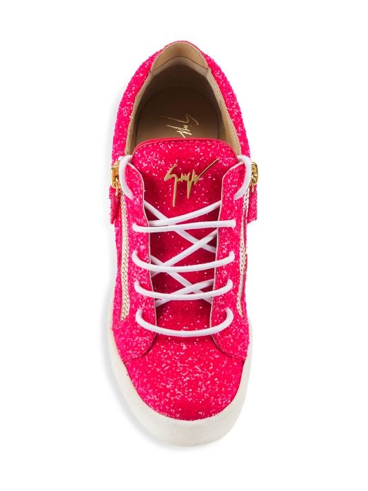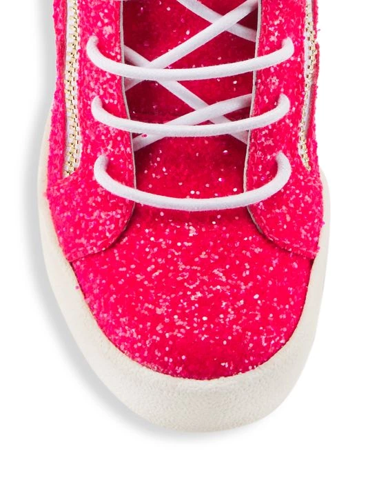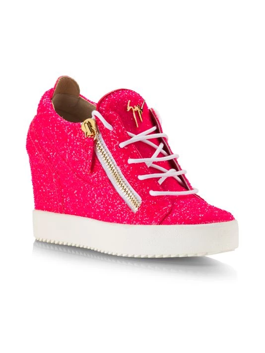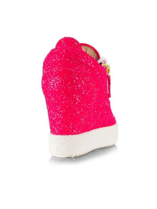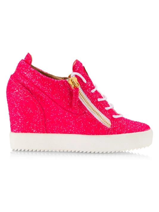 Eye-catching glittery sneakers are elevated with a covered wedge heel, rubber platform sole, and a side zip closure.