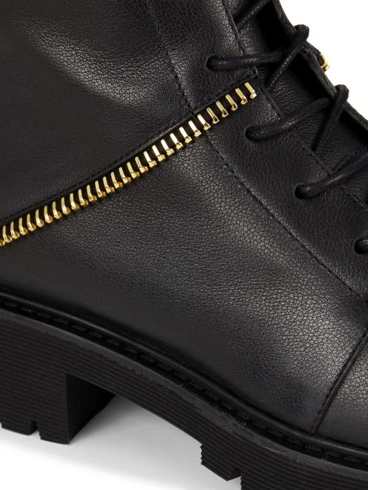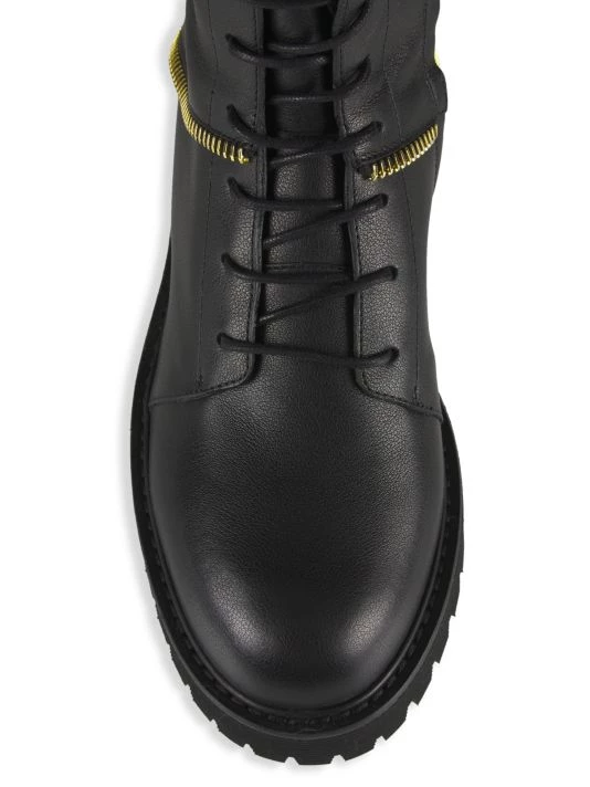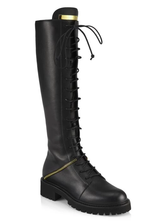 Crafted of smooth supple leather with a lugged rubber sole, these knee-high boots are highlighted with goldtone zip tooth accents.
