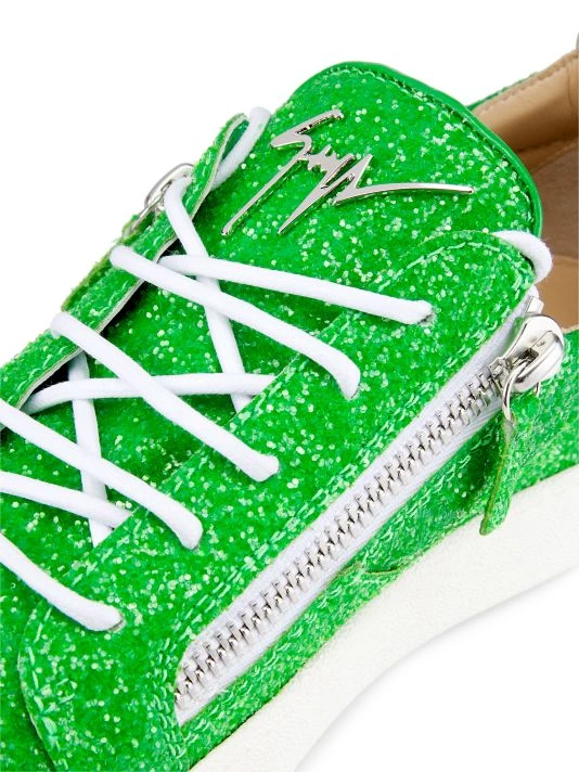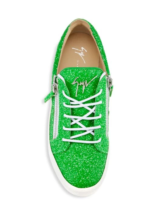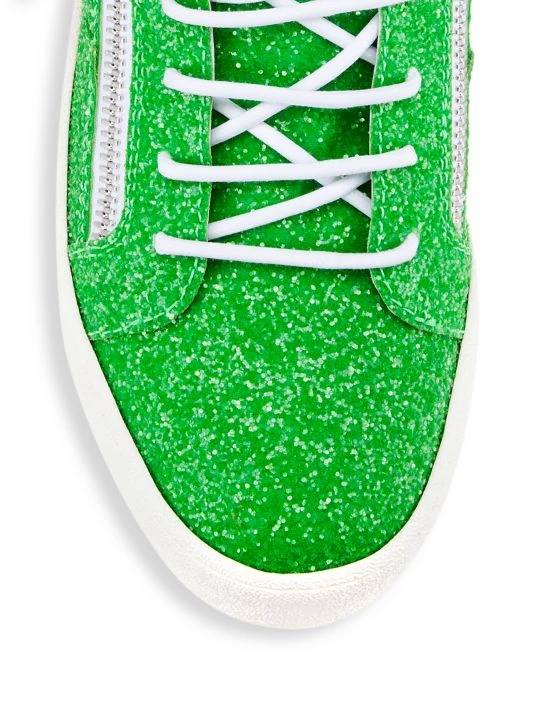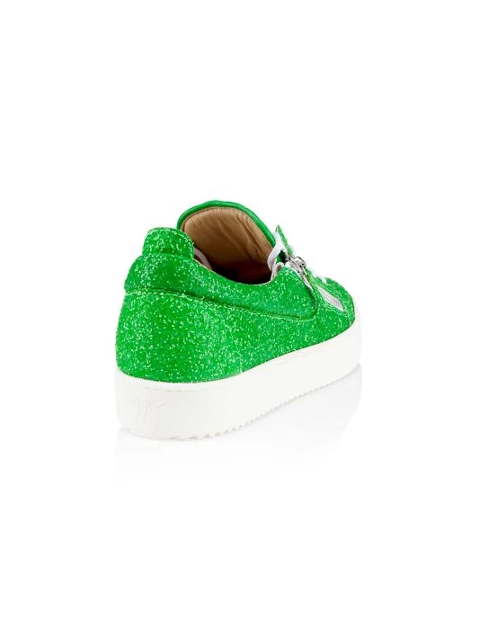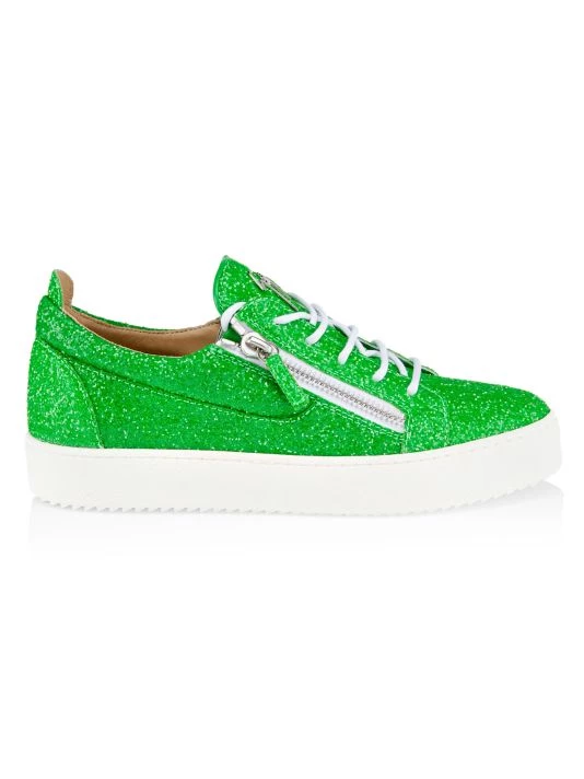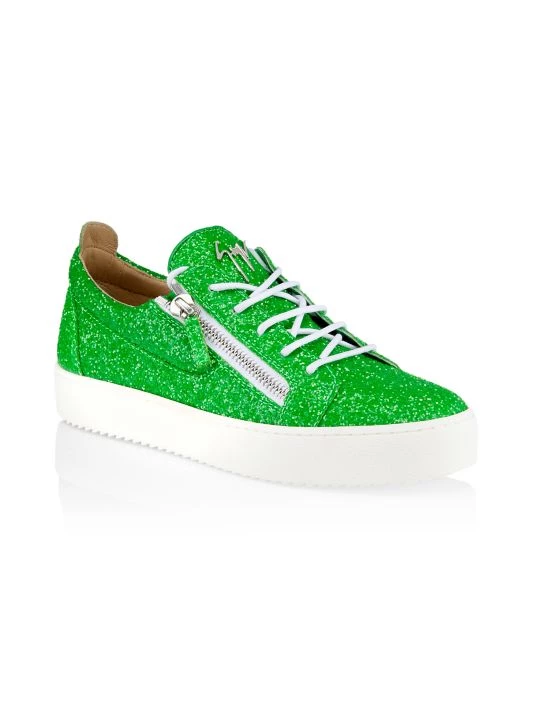 A glittery finish elevates these low-top sneakers, designed with minimalist construction and a zip closure.