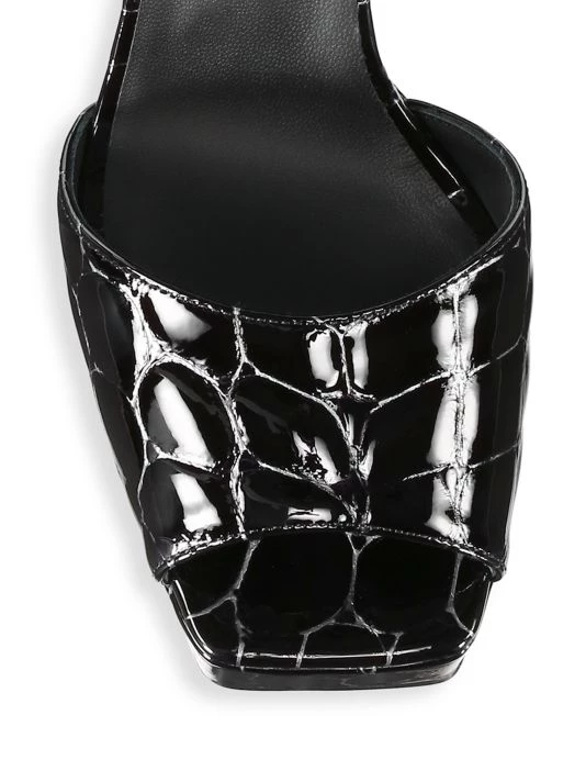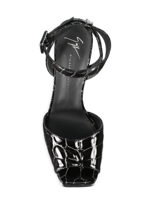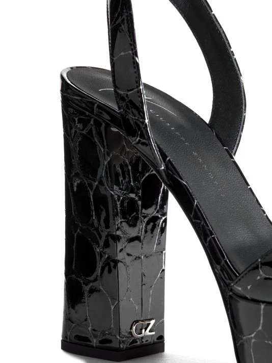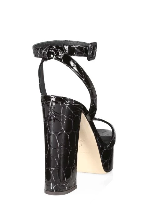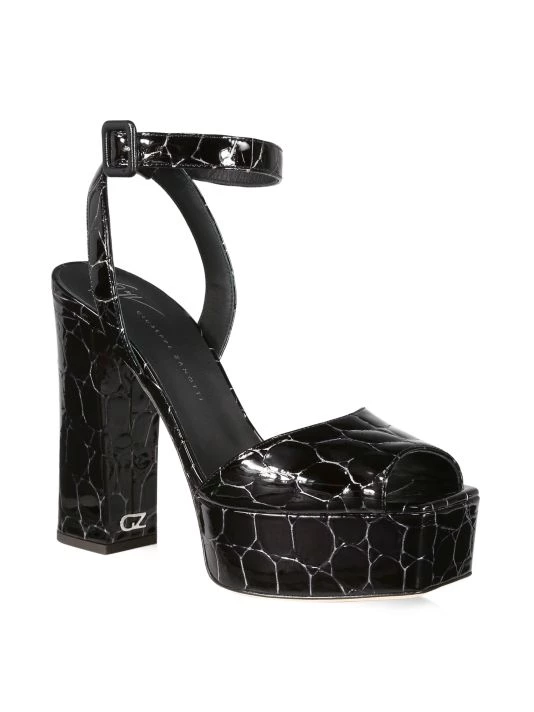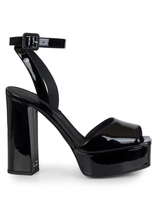 Crafted from glossy patent leather, these towering sandals embody glamour.