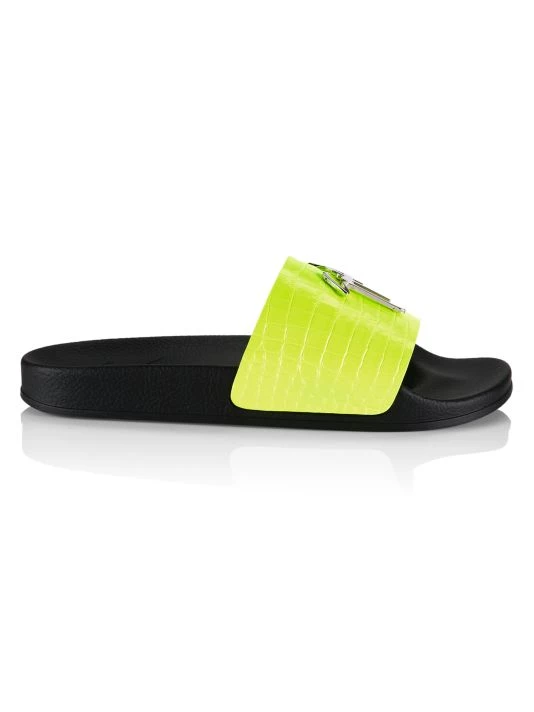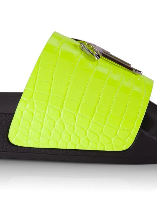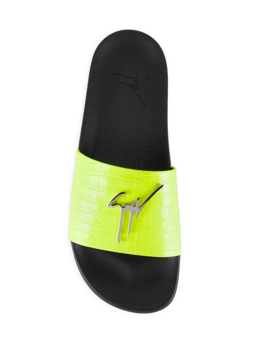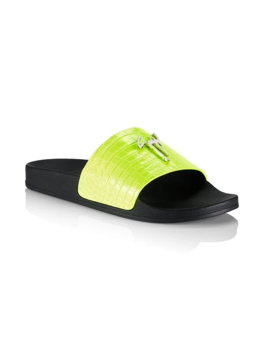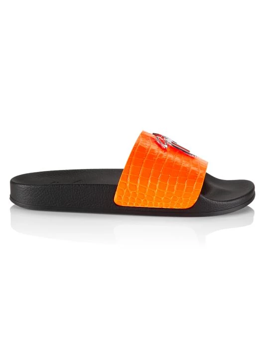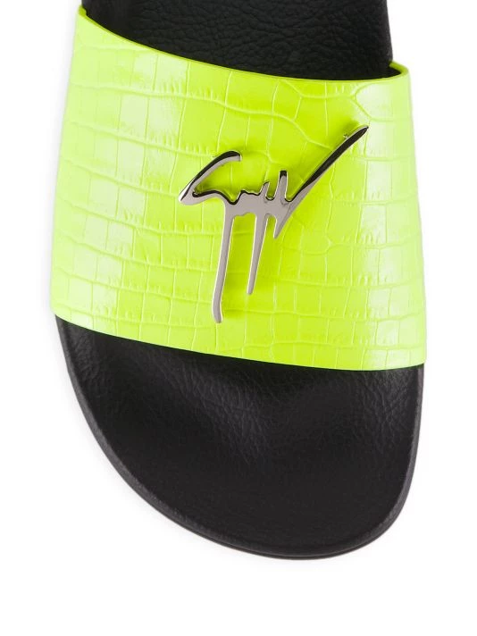 These slides feature a croc-embossed leather strap adorned with the brand’s signature metal logo plaque.