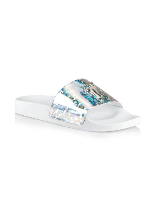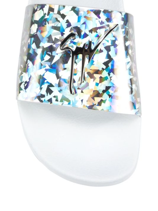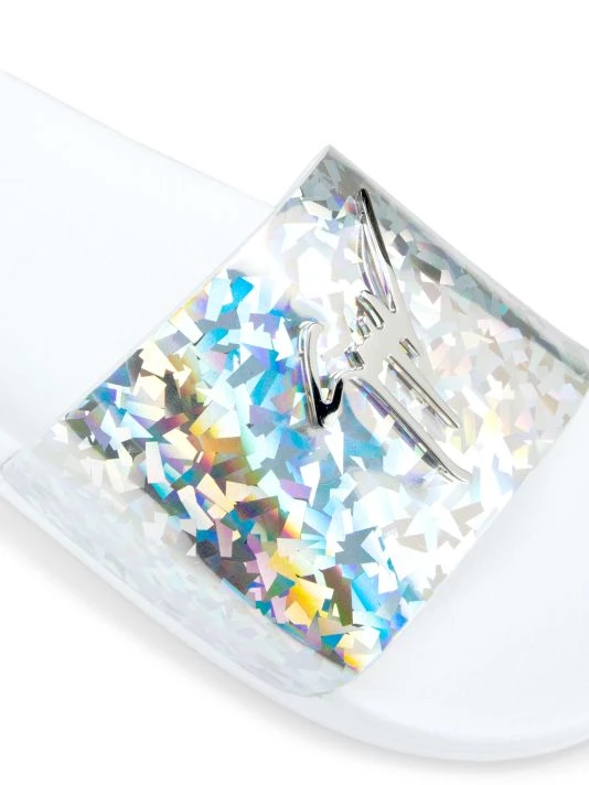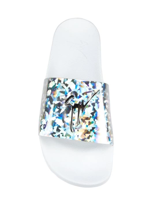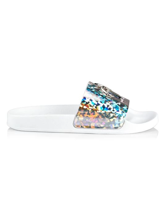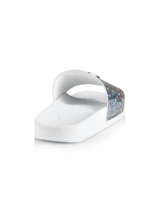 The metal logo plaque and fragmented holograph upper illuminate these pool slides.