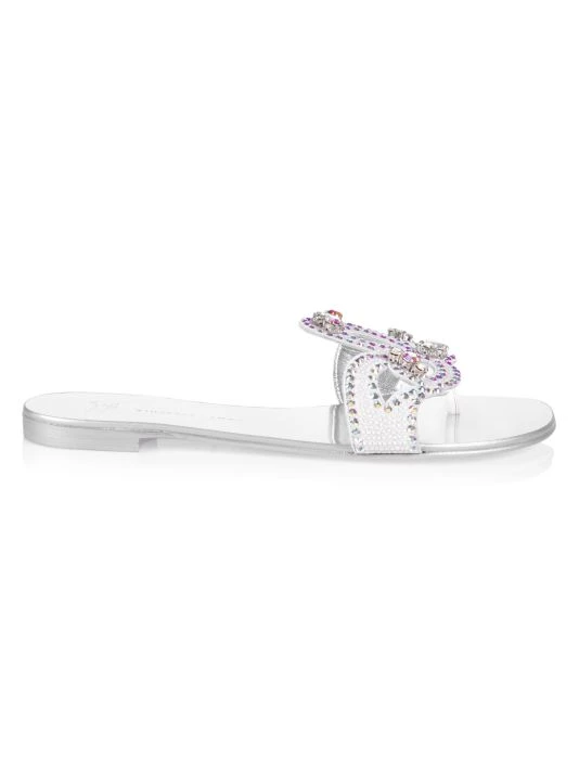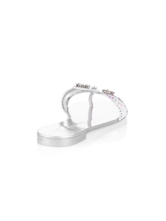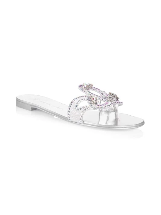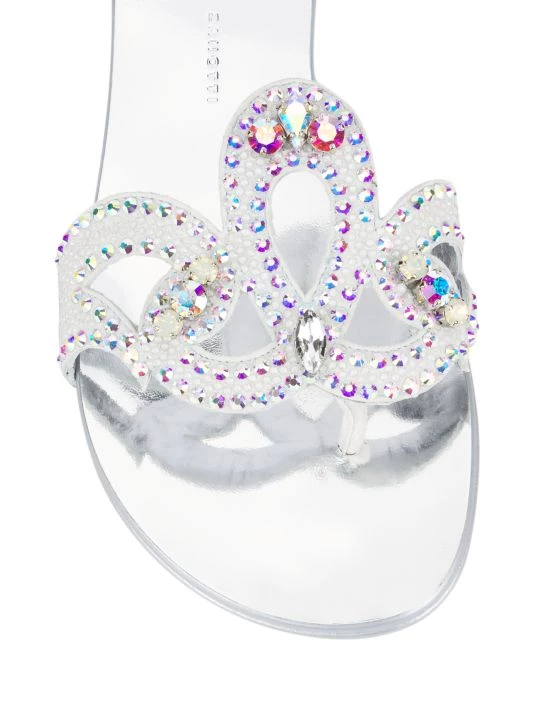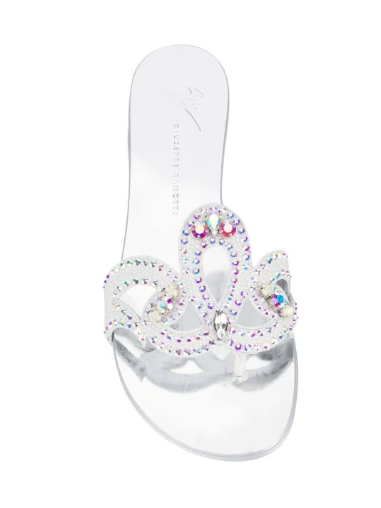 Shimmering holographic crystals add shine to these cutout thong sandals.