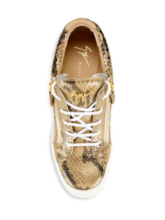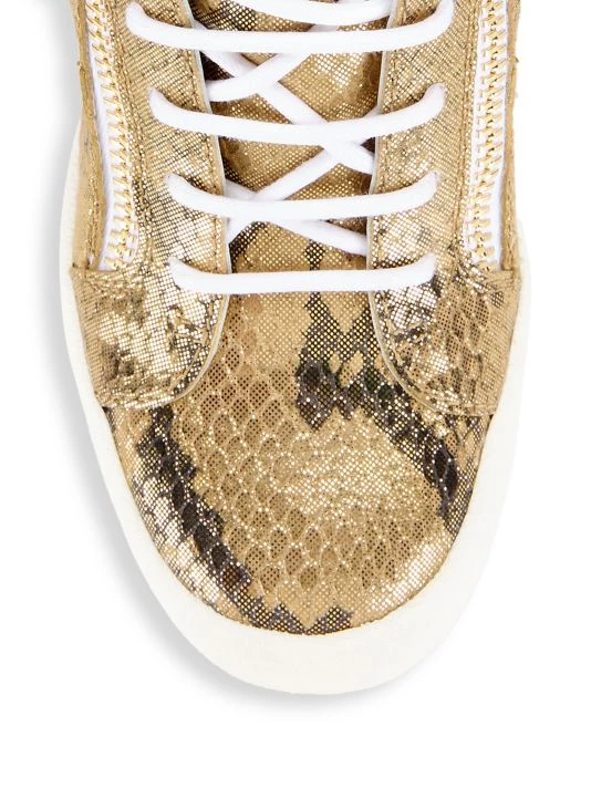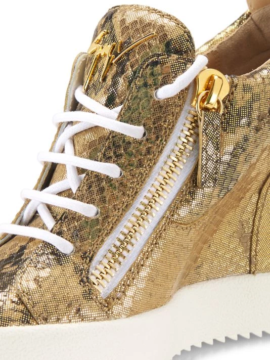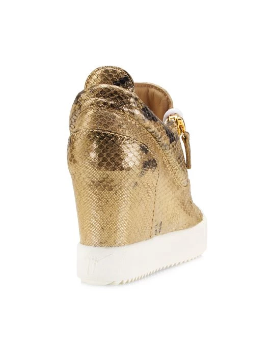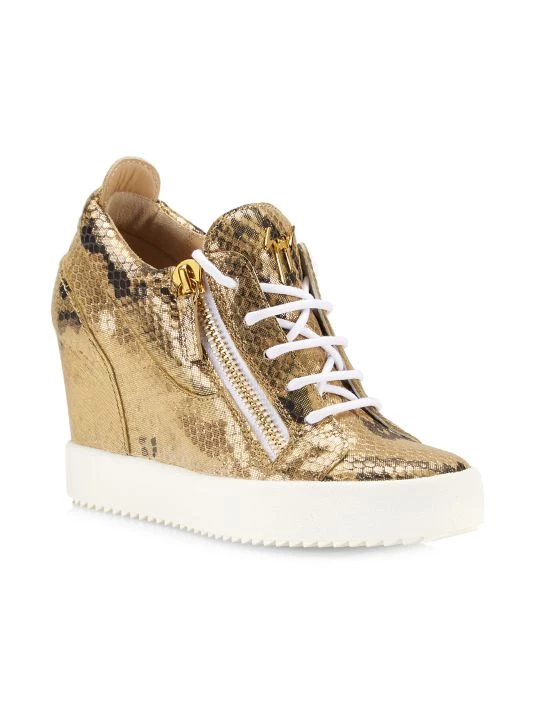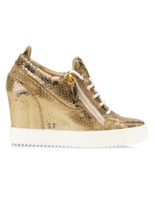 These leather sneakers are elevated with snakeskin patterning and a wedge heel.