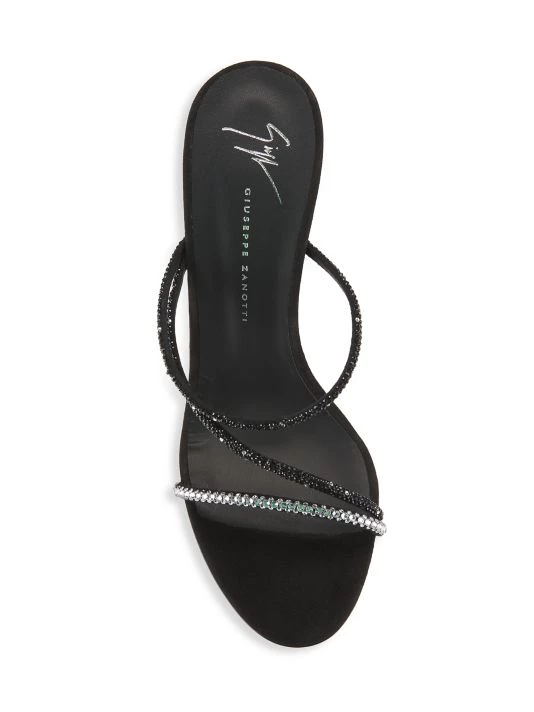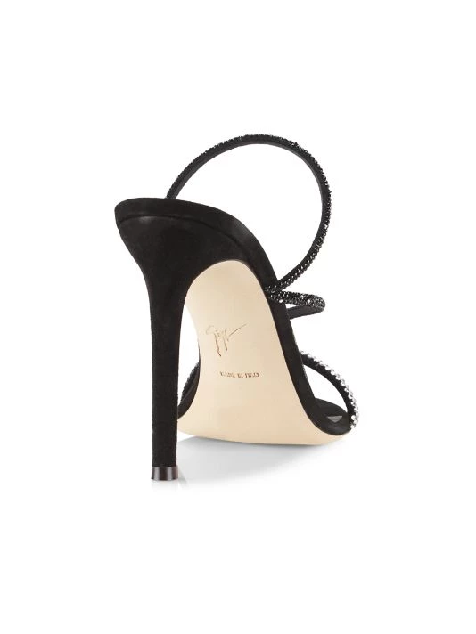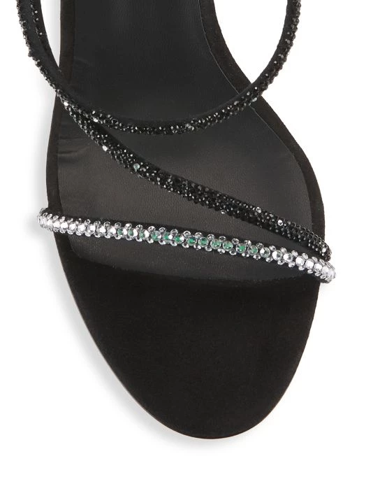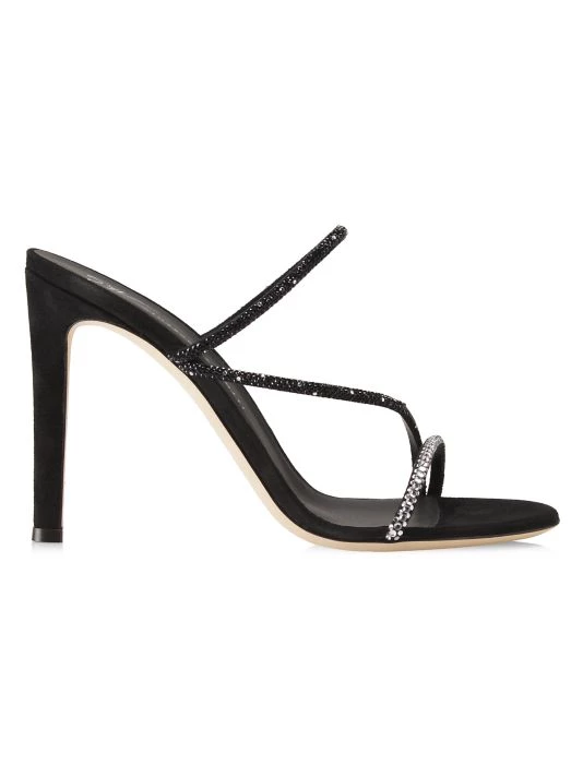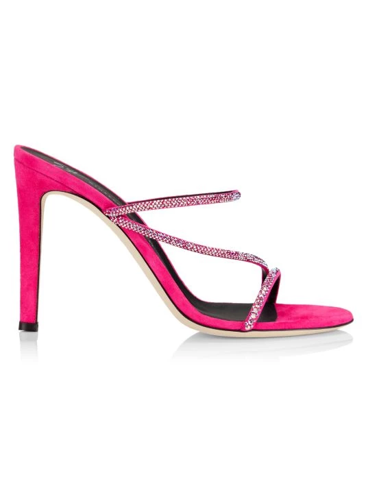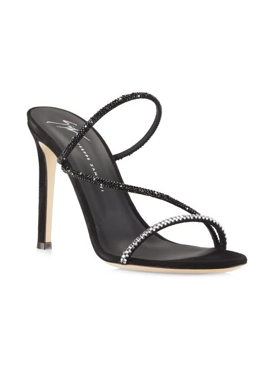 These suede high-heel sandals flaunt a trio of shimmery straps.