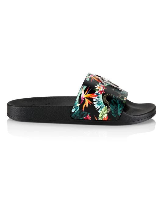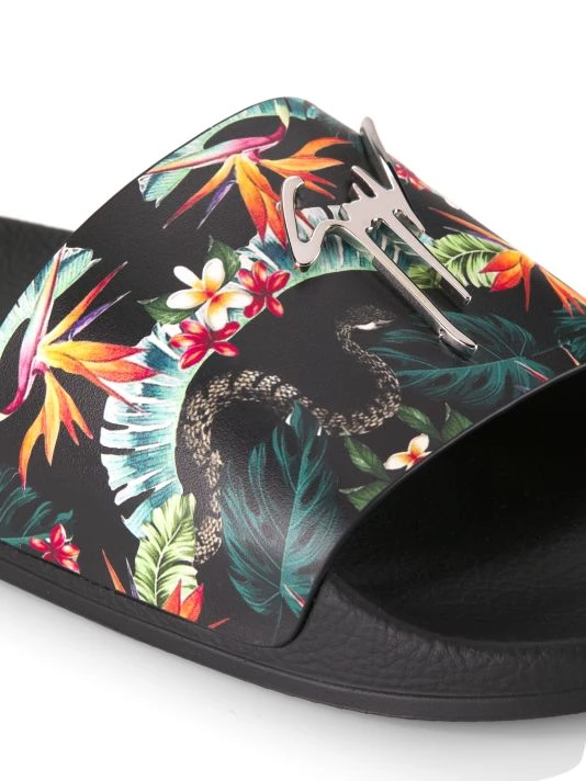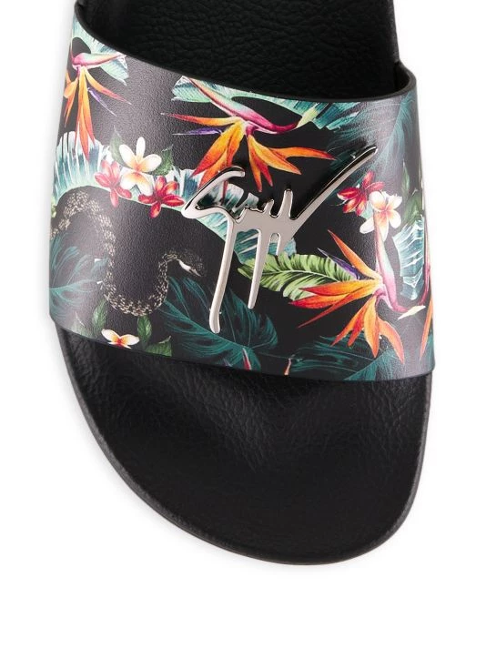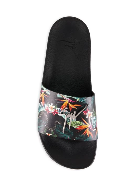 These slides feature a floral-print leather strap adorned with the brand’s signature metal logo plaque.