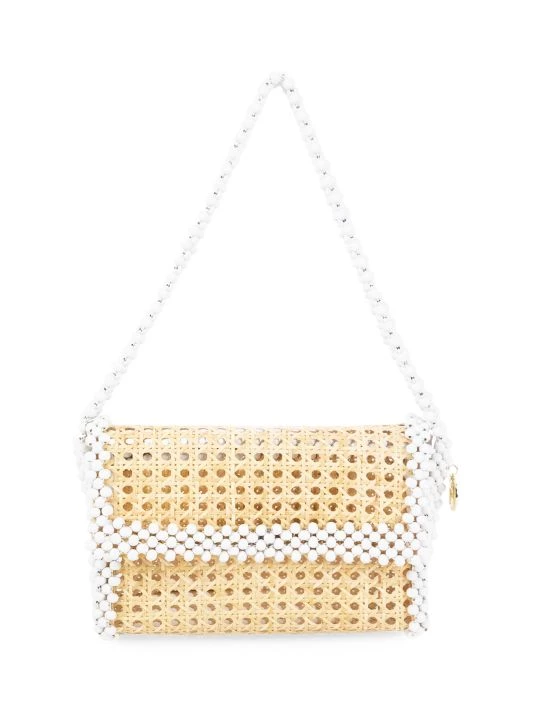 Rosantica’s Alida bag is designed in an earthy wicker silhouette. Trimmed with decorative wooden beads, this piece is accompanied by a signature logo charm.