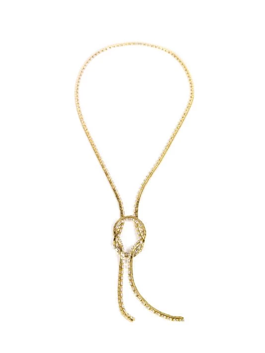 Rosantica’s Clara lariat necklace is crafted of goldtone metal embellished with sparkling baguette crystals.