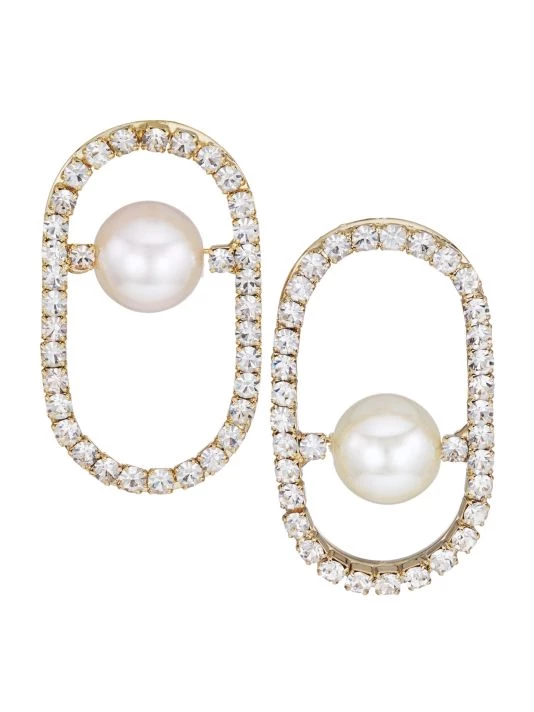 From the Dedica Collection. Showcasing mismatched silhouettes, Rosantica’s goldtone earrings are accented with shimmering crystals and luminous white resin pearls. This sculptural pair is crafted entirely by hand in Milan, Italy.