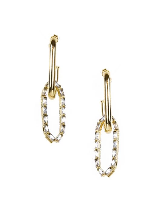 Crafted of goldtone metal, Rosantica’s earrings feature oval hoop drops embellished with sparkling baguette crystals.