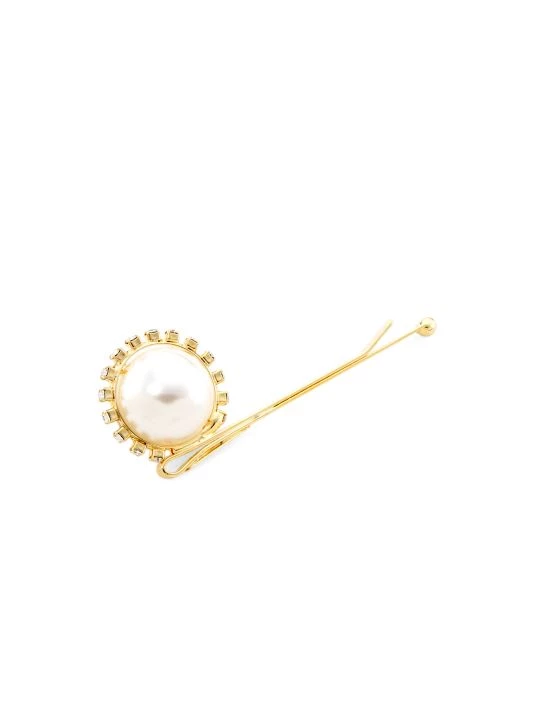 This luminous goldtone bobby pin is accented with a faux pearl and sparkling crystal embellishment.