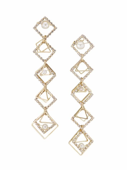 These exquisite goldtone statement earrings feature five-tier drops adorned in dazzling crystals, faux pearls, and dangling geometric accents.