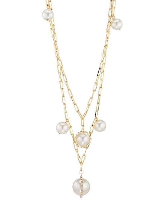 This layered necklace is crafted of goldtone brass and features faux pearls accented with glittering synthetic crystals.