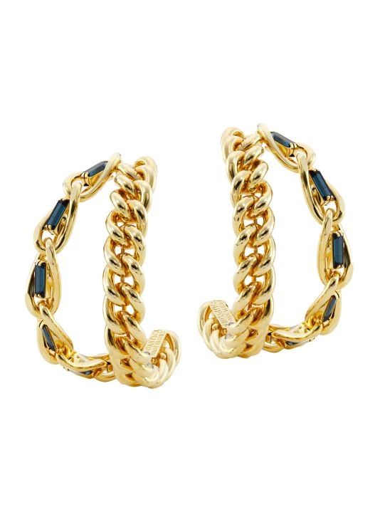 Crafted of goldtone metal set with sparkling baguette blue crystals, Rosantica’s Greca earrings feature a double-hoop design.