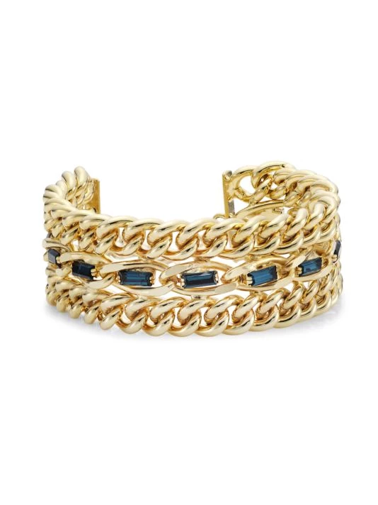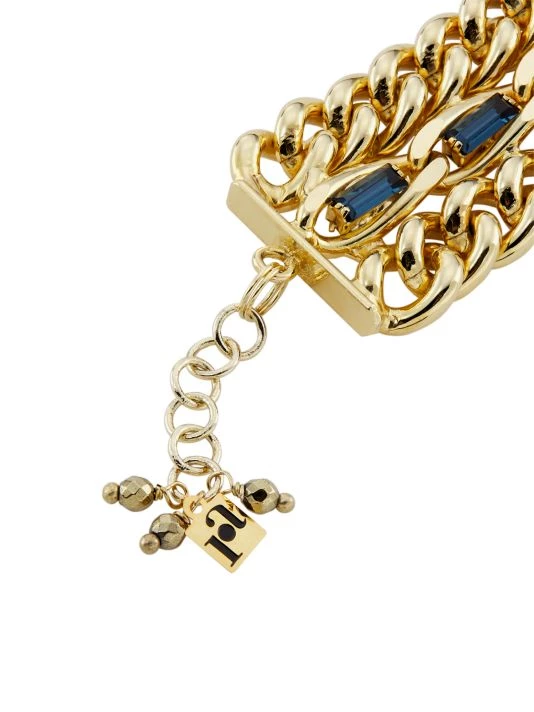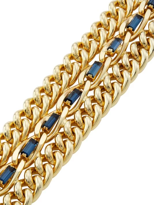 Made from goldtone metal, this striking chain bracelet is adorned with blue baguette faux crystals.
