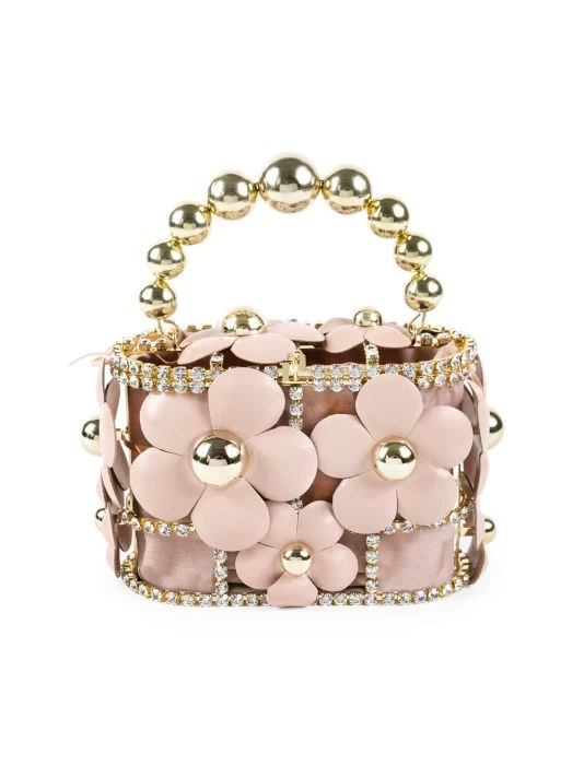 Handmade in Milan, Italy, Rosantica’s Holli Primula bag is designed in a signature caged silhouette dressed in lustrous crystals and three-dimensional-flower appliqués. A decorative handle tops this statement piece.