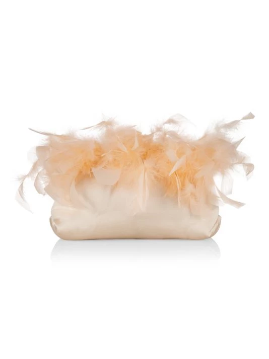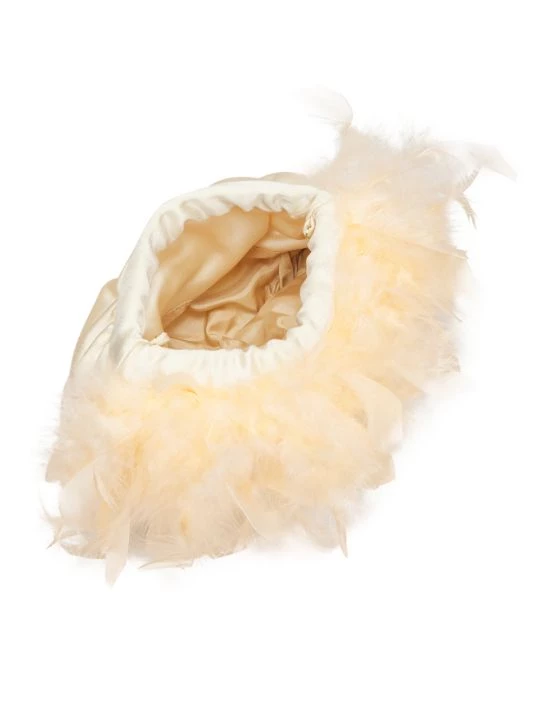 This satin pouch is finished with a luxurious feather trim and a removable strap.