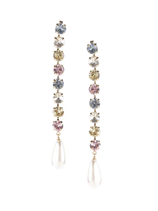 Bright oversized crystals embellish these linear drop earrings, finished with a teardrop faux pearl.