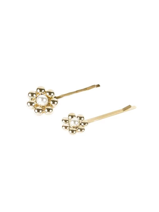 A 2-piece bobby pin set featuring floral-shaped accents with goldtone petals and faux mother-of-pearl centers.