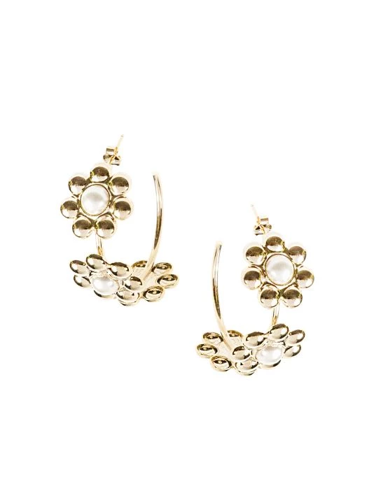 These hoop earrings are crafted of goldtone brass and showcase floral adornments with faux mother-of-pearl cabochons.