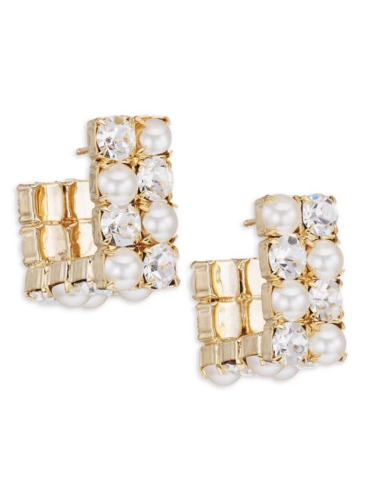 From the Polka Collection. Crafted of goldtone metal, Rosantica’s squared hoop earrings are embellished with lustrous white resin pearls and sparkling round glass crystals.
