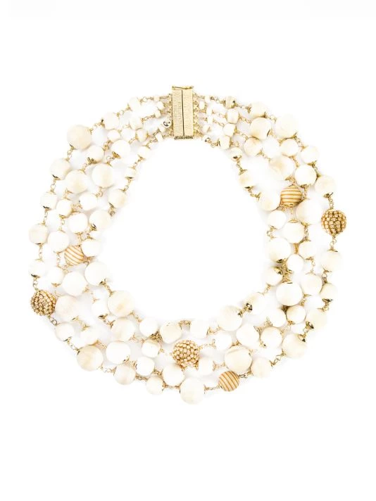 Accented with sparkling white crystals, Rosantica’s Preziosa necklace is handcrafted of goldtone metal and wood beads.