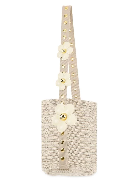 Handmade in Milan, Italy, of woven fabric, Rosantica’s Primula bucket bag features a grommeted grosgrain shoulder strap adorned with three-dimensional-flower appliqués.