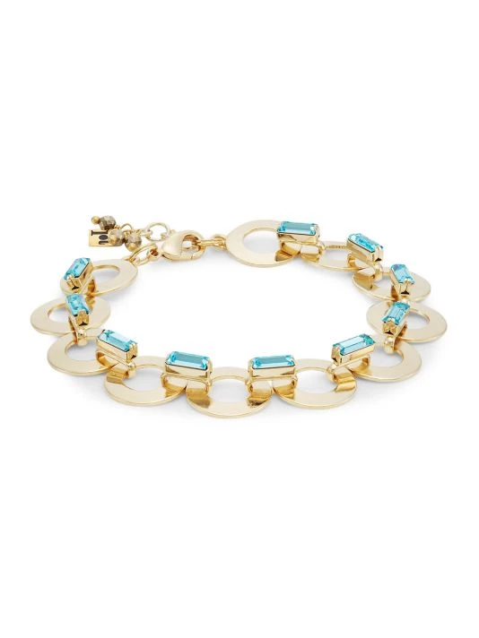 From the Rondella Collection. Made of polished goldtone metal, Rosantica’s bracelet sparkles with light blue baguette crystals.