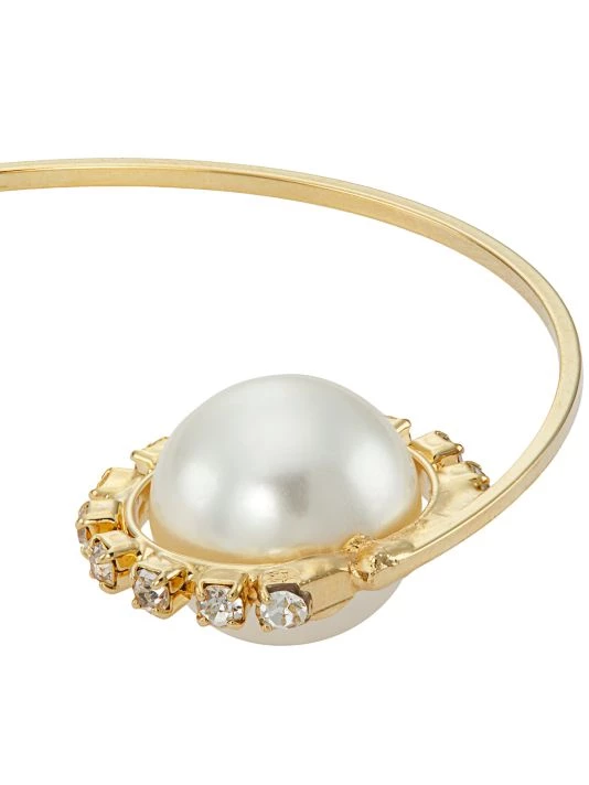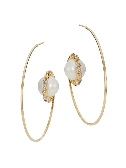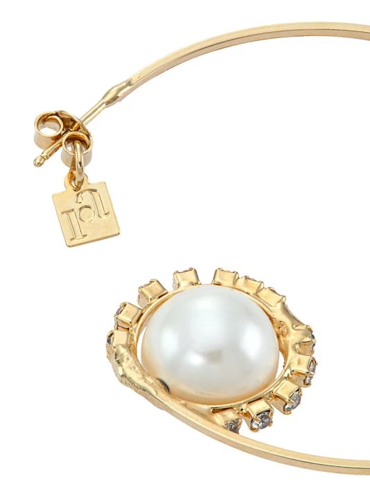 Made of goldtone brass, Rosantica’s Satelliti open hoop earrings feature a faux pearl accented with glistening crystals inspired by the cosmos.