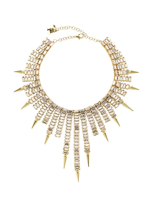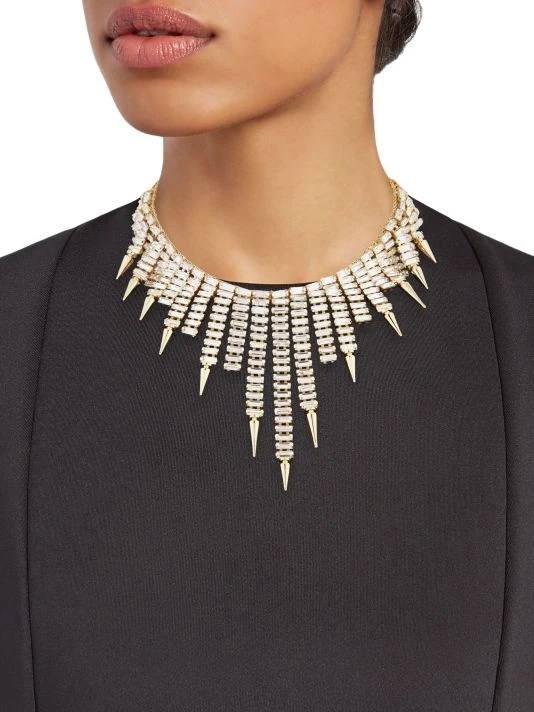 This bold goldtone collar necklace features crystal-embellished segments tipped with spikes.
