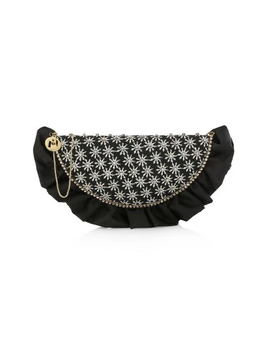 Taking the shape of a taco, Rosantica’s Taco Gelsomino bag is decorated with gleaming floral-shaped crystals. This sculptural piece is trimmed with elegant ruffles.